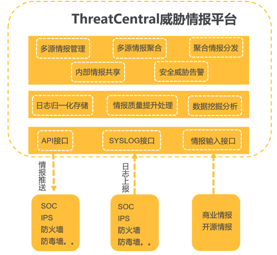 The collision between threat intelligence and local security logs is realized by collecting syslog logs. The access update of multi-source threat intelligence changes the disadvantage that single threat intelligence cannot be used by multiple devices and reduces the resource input; At the same time, it provides API interface, security equipment and security management platform for rapid integration, which reduces the development workload of users during the landing process of threat intelligence.