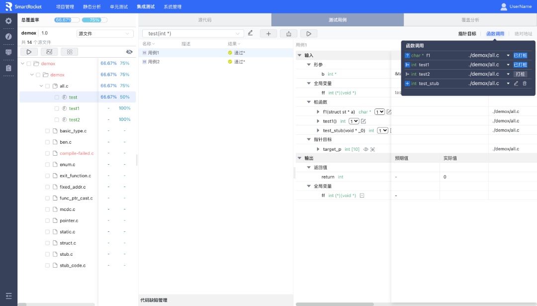 支持部分集成和全部集成,可以自主設(shè)置調(diào)用函數(shù)是否打樁,充分實現(xiàn)不同情況下不同集成測試的需求。支持查看函數(shù)之間的調(diào)用關(guān)系,可以進行圖形化的用例管理,滿足功能正確性測試和結(jié)構(gòu)化覆蓋率測試等要求。