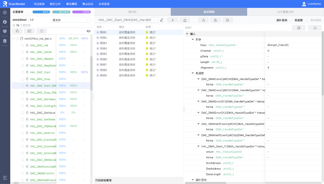 SmartRocket TestGrid支持靜態(tài)分析,滿足根據(jù)國軍標(biāo)、MISRA標(biāo)準(zhǔn)對源碼進行質(zhì)量分析;支持C/C++語言的單元測試,采用人工智能算法,利用自動推理與符號執(zhí)行技術(shù),分析程序路徑,產(chǎn)生滿足覆蓋率的測試用例并在后臺自動執(zhí)行,對于C代碼可以自動生成覆蓋率高達(dá)100%的測試用例;支持不同程度的集成測試,用戶通過設(shè)置調(diào)用函數(shù)是否打樁,實現(xiàn)調(diào)用函數(shù)集成程度的自主控制。
