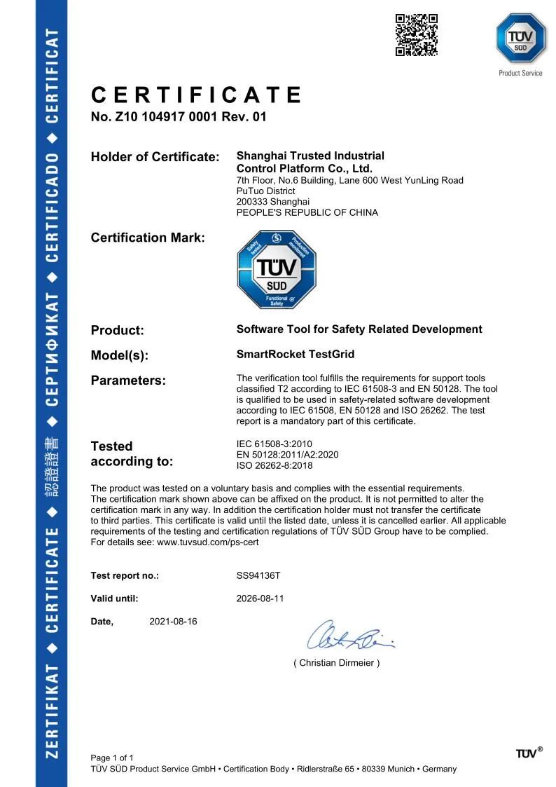 產(chǎn)品獲TüV南德頒發(fā)的功能安全證書