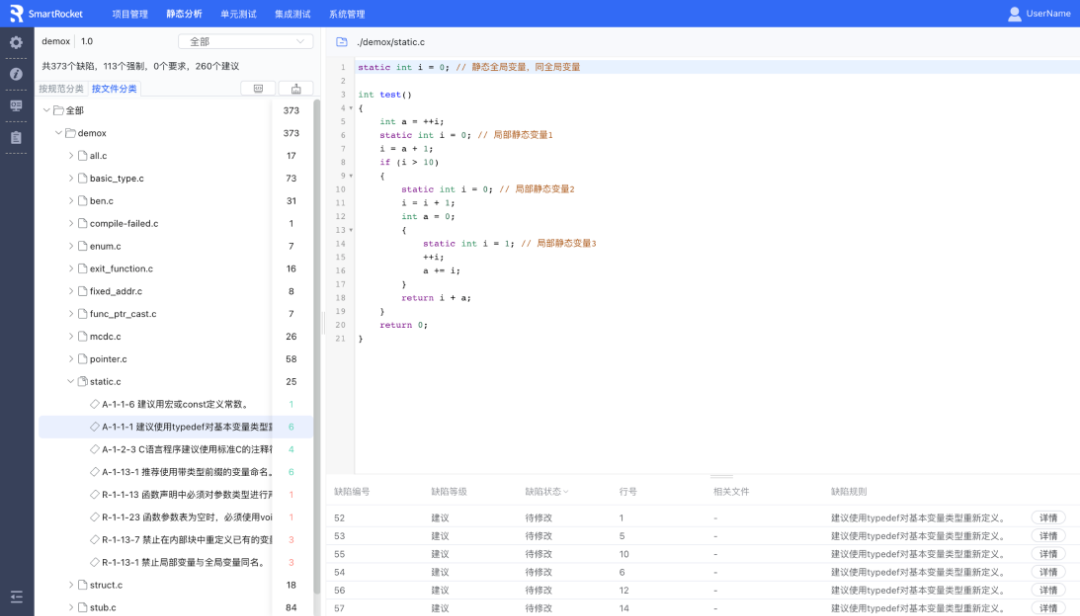 支持缺陷掃描和質(zhì)量審查,分析完成后,可以同時進行缺陷查看和缺陷定位,能夠大幅度提升代碼健壯性。