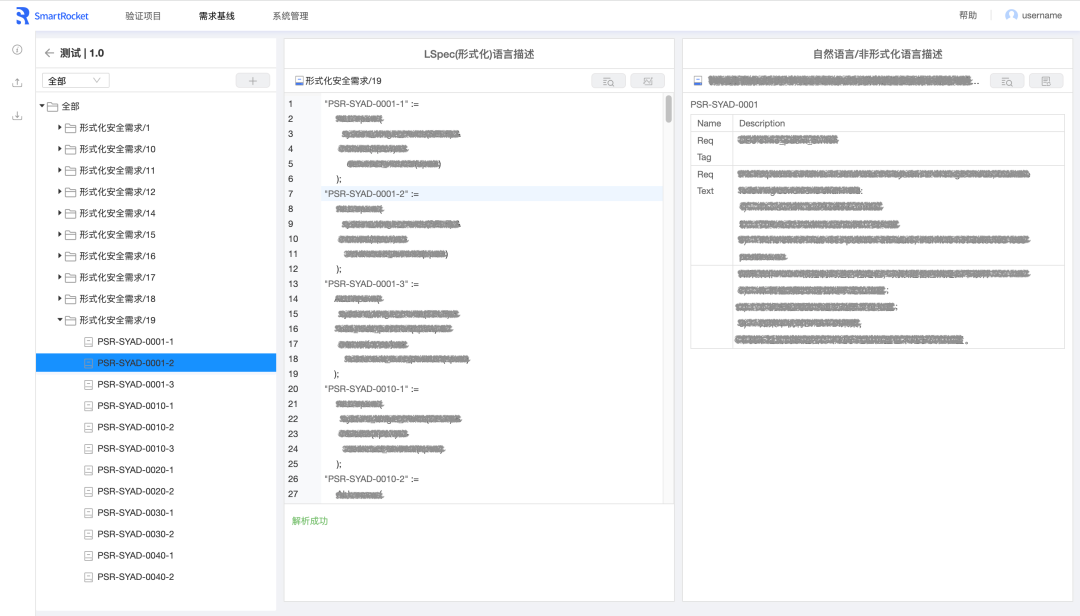 支持在線導入安全需求文件或對安全需求進行增刪查改,支持根據需求編號查找對應的形式化語言LSpec描述和自然語言描述,支持一鍵解析安全需求,通過解析查找其語法錯誤,并定位該錯誤。