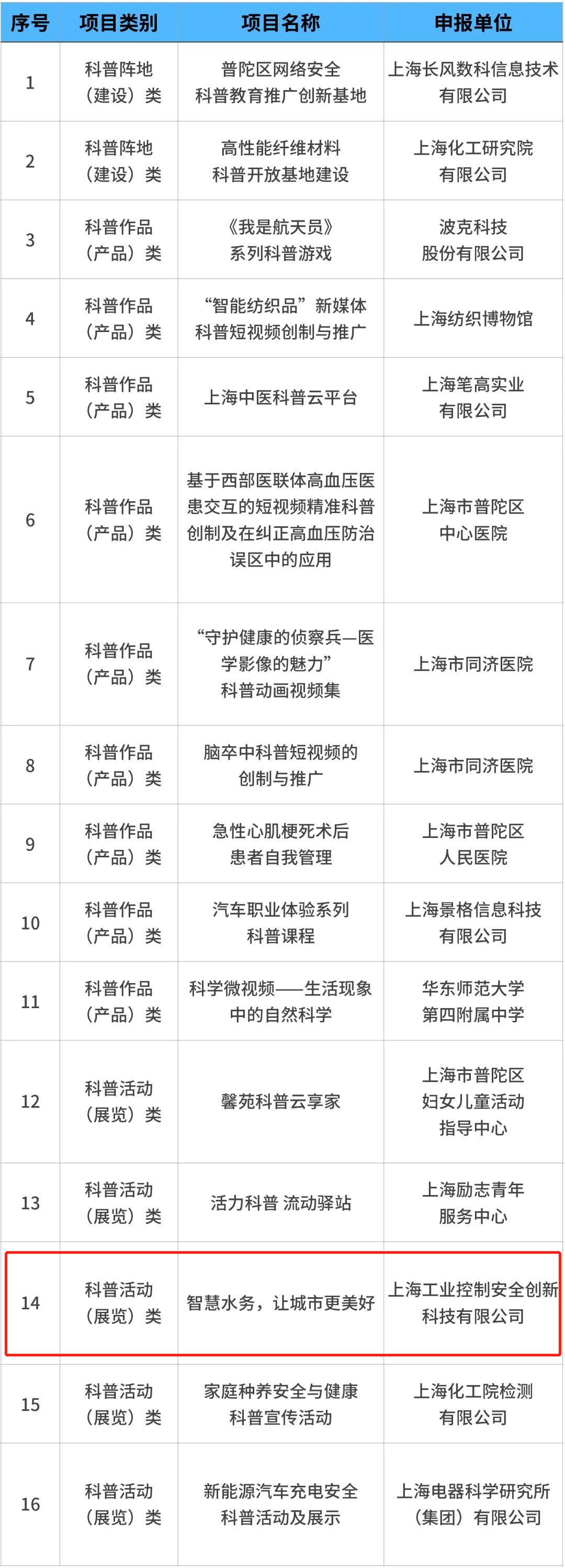 近日,上海市普陀區科學技術委員會公布了“2022年普陀科普創新項目”立項名單,經過嚴格的形式審核、項目初審、專家評審等流程,對共計16個項目予以立項。上海控安“智慧水務,讓城市更美好”科普創新項目成功進入立項名單。