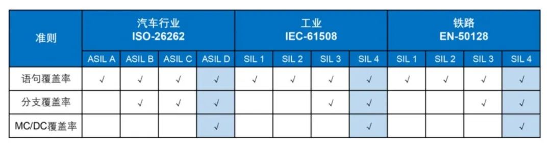 不同行業、領域的功能安全標準在不同等級下對覆蓋率的要求稍有不同,如汽車領域的 ISO-26262、工業領域的 IEC-61508 功能安全標準等,但是最高等級下都需要包含語句覆蓋率、分支覆蓋率和 MC/DC 覆蓋率。