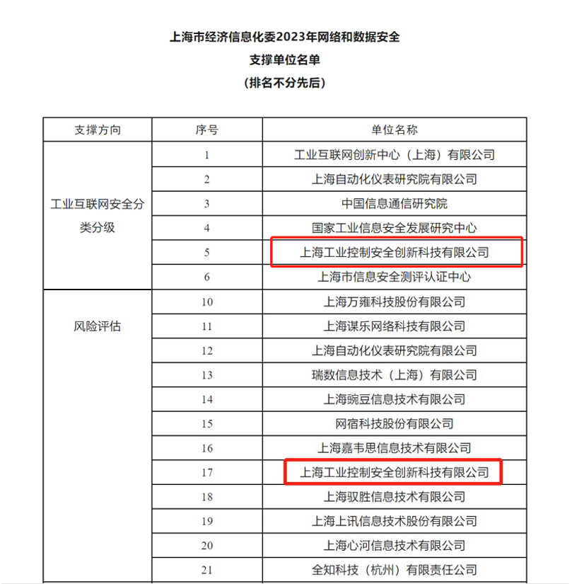 近日,上海市經(jīng)濟(jì)和信息化委員會(huì)公布2023年網(wǎng)絡(luò)和數(shù)據(jù)安全支撐單位名單,共遴選出34家單位作為2023年網(wǎng)絡(luò)和數(shù)據(jù)安全支撐單位。經(jīng)資格審查、專家評(píng)審等環(huán)節(jié),上海控安成功入選“工業(yè)互聯(lián)網(wǎng)安全分類分級(jí)”與“風(fēng)險(xiǎn)評(píng)估”兩個(gè)方向支撐單位。
