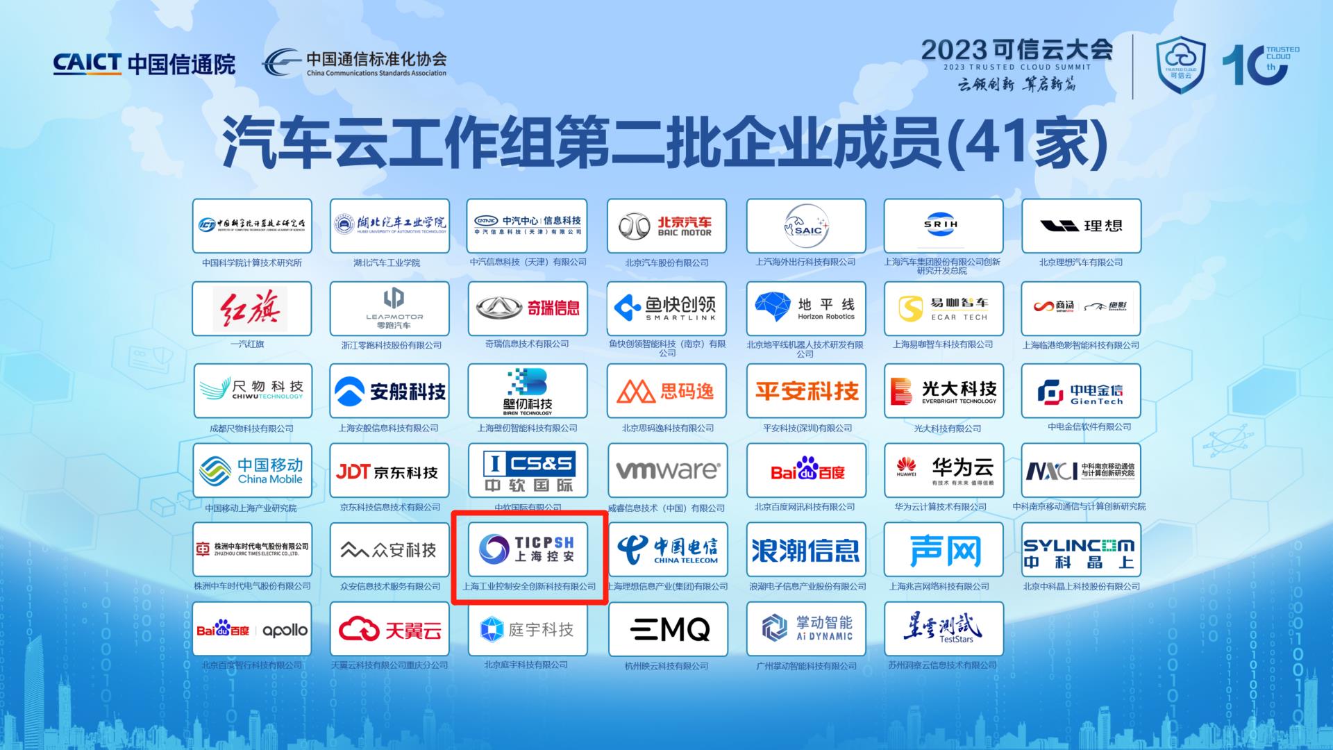 7月25-26日,由中國信息通信研究院、中國通信標準化協會聯合主辦的“2023年可信云大會”隆重召開。會上,中國信通院正式公布了“汽車云工作組第二批企業成員”名單,上海控安、上汽研發總院、奇瑞信息、百度智行等41家企業成功入選。