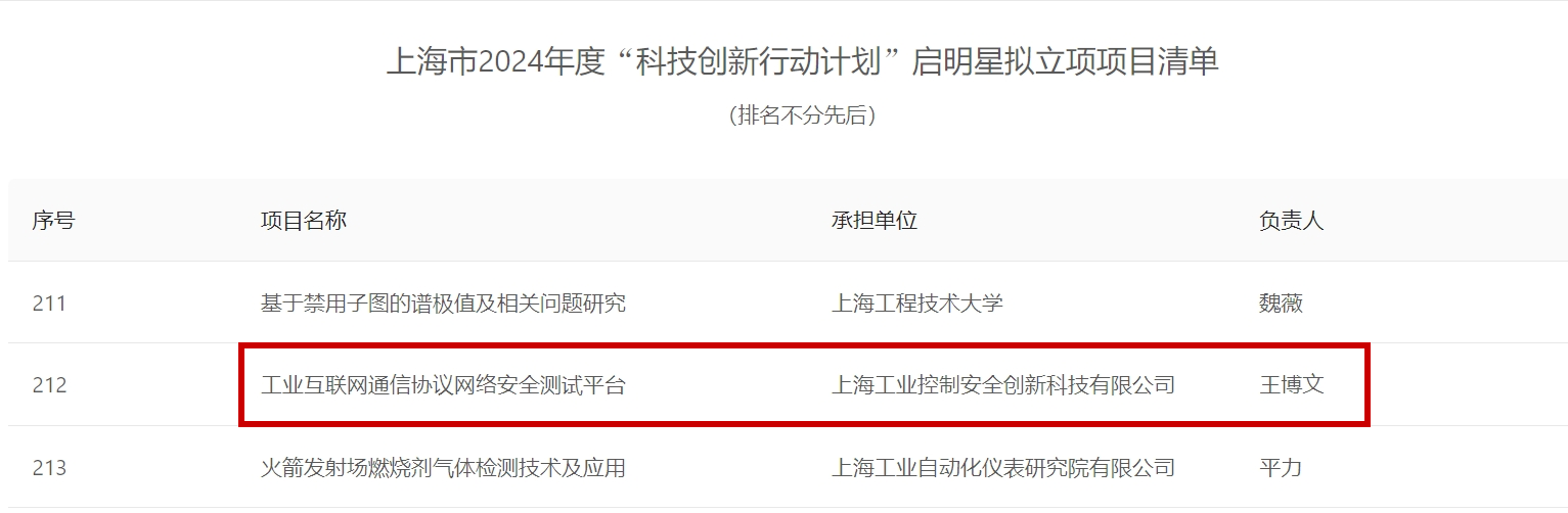 近日,上海市科學技術委員會公布2024年度“科技創新行動計劃”啟明星項目入選結果,一批來自全市各領域的高水平科研團隊創新項目脫穎而出。上海控安與華東師范大學聯合培養博士后王博文牽頭項目“工業互聯網通信協議網絡安全測試平臺”,成功入選啟明星項目。
