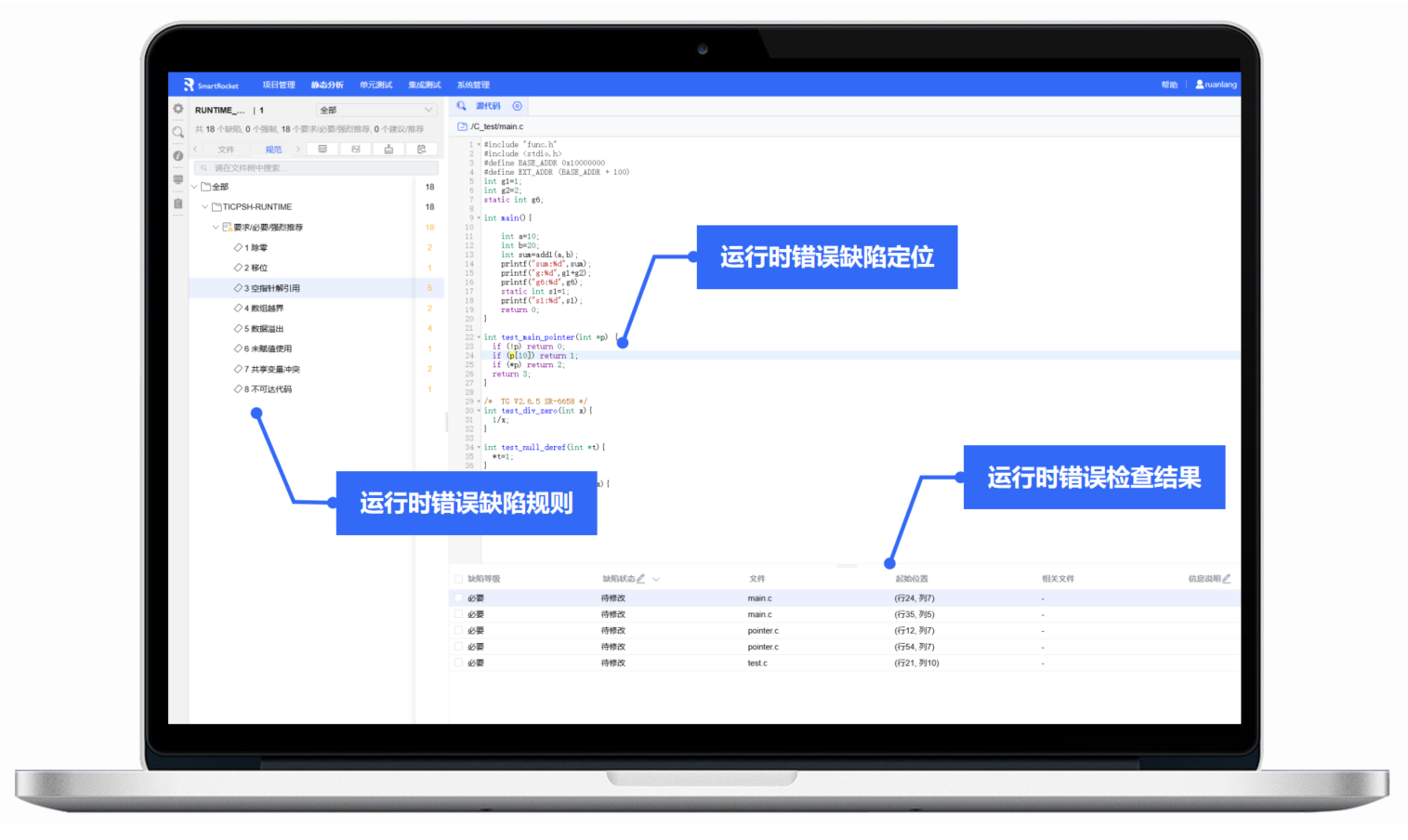 ? 支持對規(guī)則掃描、運行時錯誤分析、單元測試、集成測試、目標機測試全流程代碼測試驗證。