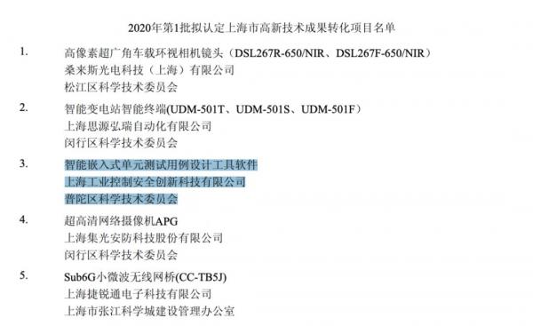 日前,上海市科學(xué)技術(shù)委員會公布了“2020年第1批上海市高新技術(shù)成果轉(zhuǎn)化項目名單”。經(jīng)企業(yè)網(wǎng)上申報、區(qū)科委等主管部門初審、網(wǎng)上專家評審和高新技術(shù)成果轉(zhuǎn)化項目認定評委會審定,上海控安“智能嵌入式單元測試用例設(shè)計工具軟件”成功入選本次上海市高新技術(shù)成果轉(zhuǎn)化項目名單。
