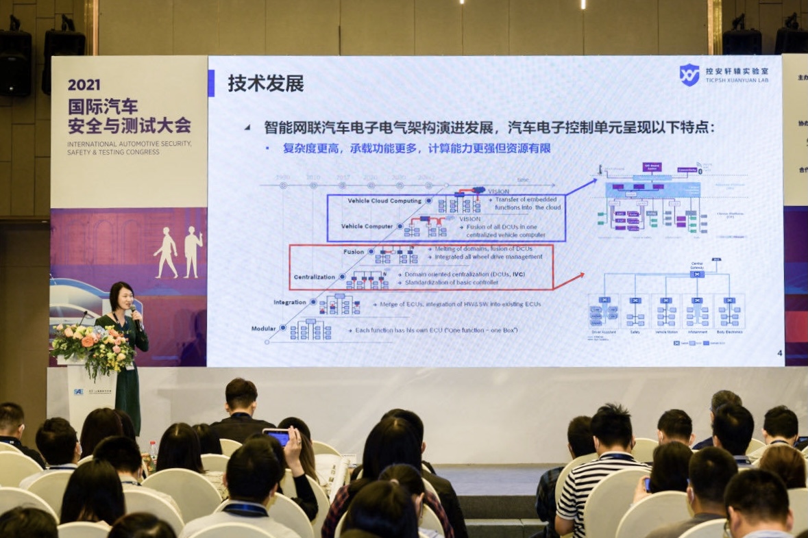 信息網絡安全分論壇現場,大咖聚集,福特汽車、TUV NORD、中汽創智、上海控安等企業專家分別圍繞汽車網絡安全議題進行分享和互動。上海控安就“智能網聯汽車信息安全測試和與其功能安全風險評估技術”話題展開介紹,從智能網聯汽車安全技術發展及標準要求、汽車信息安全測試體系及案例分析、預期功能安全風險評估及場景構建等角度逐層剖析。