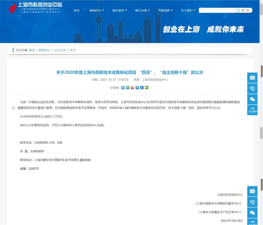 為進一步激勵企業自主創新,總結高新技術成果轉化成效,發揮示范帶動效應,上海市科技創業中心在2020年度全市高新技術成果轉化項目動態跟蹤統計數據梳理和調研基礎上,根據各區科技主管部門推薦,經過指標篩選和專家評議等程序,先選出銷售收入和各項綜合指標良好的100個項目為“2020年度上海市高新技術成果轉化項目百佳”,再從百佳項目中擇優評選出“2020年度上海市高新技術成果轉化項目自主創新十強”,上海控安技術成果獲此殊榮。