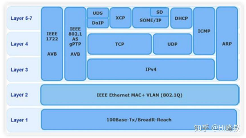 車載以太網協議是一組多個不同層次上的協議簇,是一個5層的協議系統,從上到下分別是應用層、傳輸層、網絡層、數據鏈路層、物理層。5層結構對應于OSI參考模型,并且提供了各種協議框架下形成的協議簇及高層應用程序,區別于傳統以太網,車載以太網的協議架構如下: