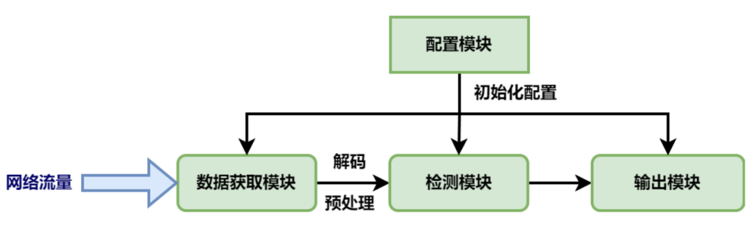 Snort的原理架構圖如圖2所示,其中包括了配置模塊、數據獲取模塊、檢測模塊以及輸出模塊。通過修改配置模塊的配置文件,可以定義數據獲取的配置、預處理的方式、檢測的規則以及輸出日志的格式。數據獲取模塊負責檢測、解析網卡中的流量并將其送入檢測模塊。檢測模塊根據配置信息,對指定的異常行為進行檢測和處理,并且會將檢測結果送入輸出模塊,由其實現輸出日志的解析、處理、封裝和轉發等功能。