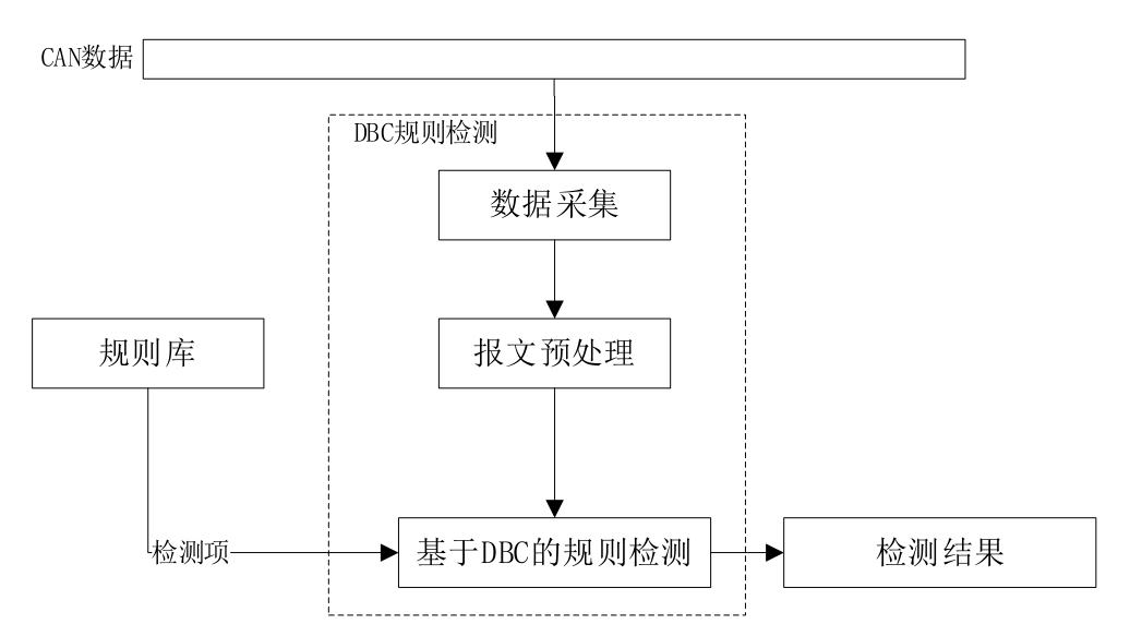 基于DBC的報文檢測,首先加載內置的規則庫。檢測時,采集CAN總線數據并進行CAN報文的預處理,然后根據規則庫中的檢測規則,對選定的報文字段進行檢測。最終輸出檢測結果。
