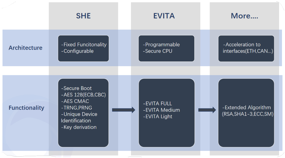Light EVITA HSM:該層級(jí)的HSM專注于確保ECU和傳感器和執(zhí)行器之間通訊的安全。其僅需要包含一個(gè)對(duì)稱加解密引擎和對(duì)應(yīng)的經(jīng)過(guò)裁剪的硬件接口。因此,Light層級(jí)可以滿足嚴(yán)格的成本和效率要求。