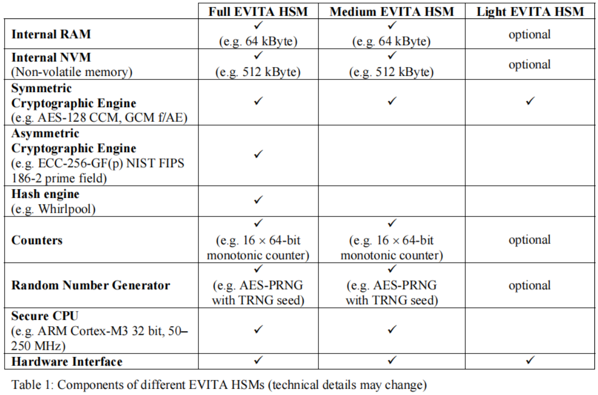 上面提到的EVITA硬件級(jí)規(guī)標(biāo)是一種被廣泛接受和應(yīng)用的HSM硬件規(guī)范。本章主要介紹EVITA HSM的三種分級(jí),具體如圖2。