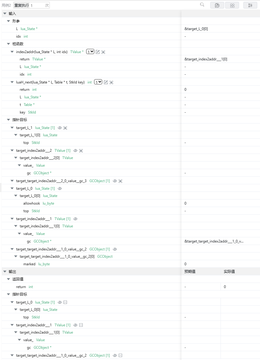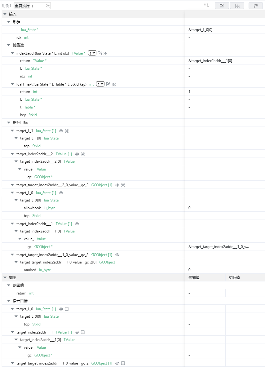 我們通過查看項目頭文件可以得到函數(shù)luaH_next()的形參hvalue(t)已有定義,通過宏替換變?yōu)閘uaH_next (L, ((&((((union GCUnion *)((((t)->value_).gc))))->h))), L->top - 1),可以通過工具來生成用例中的樁函數(shù),下圖為工具自動生成的測試用例1: