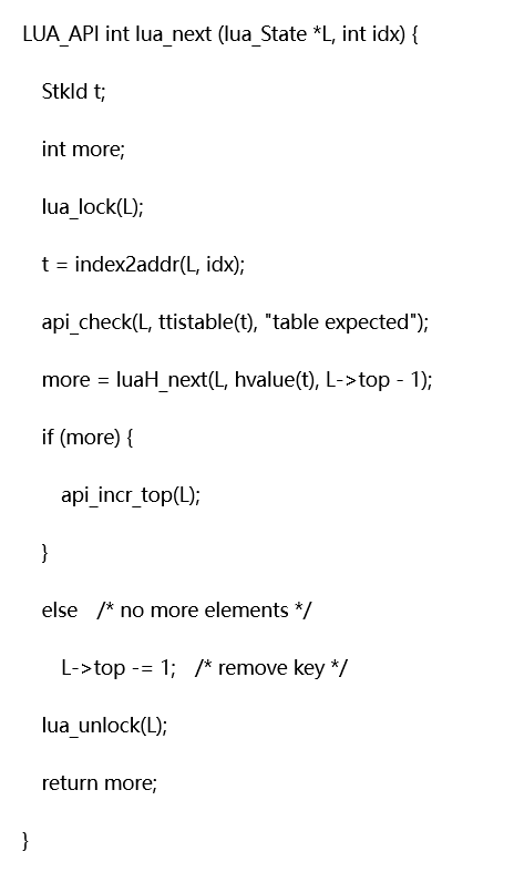 這段代碼我們可以看到函數(shù)的形參有兩個,分別是lua_State *L、init idx,代碼邏輯也較為簡單,當more為真時執(zhí)行api_incr_top(L),為假時執(zhí)行L->top -= 1。more為代碼塊中定義的局部變量,被賦值為luaH_next(L, hvalue(t), L->top - 1)。