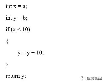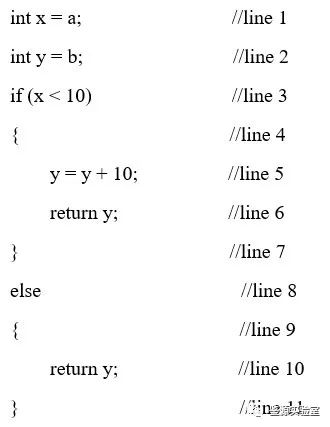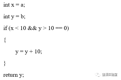 這段代碼總共11行,一個邏輯判斷的條件,即x<10為真或假,我們可以看到輸入的變量a和b決定了輸出值y。對于這段代碼的分支覆蓋測試設計,我們令a=5或a=15,對應x<10為真或假兩種情況。a=5時x<10為真,測試用例執(zhí)行了代碼的第1-6行進入了邏輯真的分支,a=15時x<10為假,代碼執(zhí)行了第1、2和8至11行,執(zhí)行了邏輯為假的分支。這兩條測試用例覆蓋全部的兩個判定分支,分支覆蓋率為100%。
