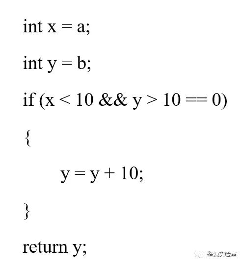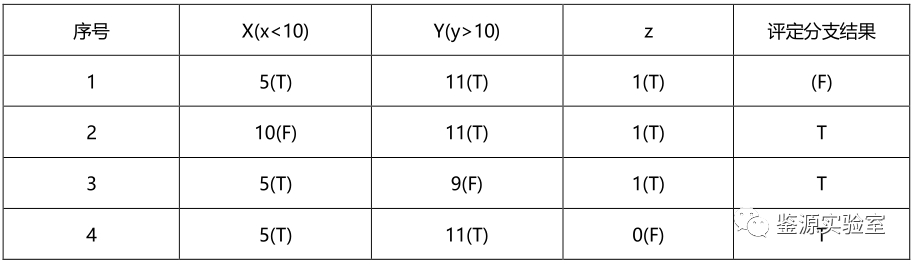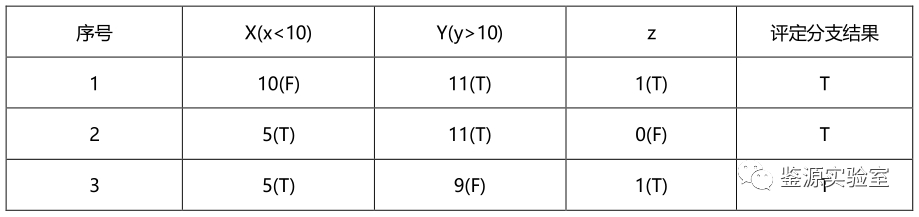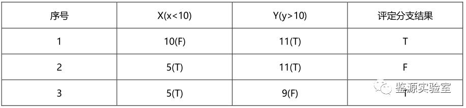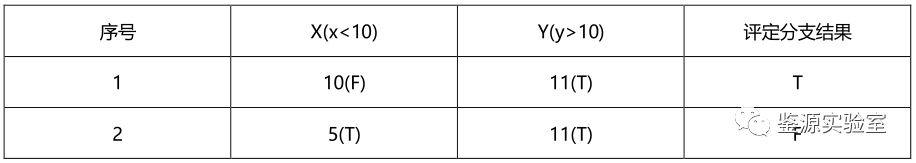 這段代碼有一個邏輯判定,x < 10 && y > 10的結果是否為假,對應判定的兩個分支。這樣設計測試用例對應判定是基于分支覆蓋來進行的,可以用如下表進行條件取值來做到分支判定100%覆蓋率。