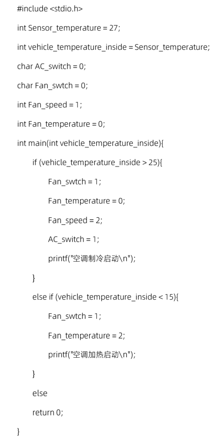 代碼要實現的邏輯是根據獲得的傳感器溫度,在車內溫度超過25攝氏度時打開空調,此時風扇啟動吹冷風,空調壓縮機啟動,風扇中檔風,返回“空調制冷啟動”;在車內溫度低于15攝氏度時打開空調,此時風扇啟動吹熱風,空調壓縮機不啟動,風扇中檔風,返回“空調加熱啟動”。