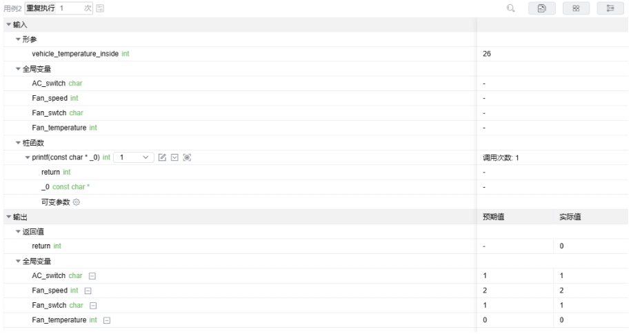 代碼定義了vehicle_temperature_inside 為車內的溫度,實際中該值通常是調用溫度傳感器讀值,本示例中簡單將溫度傳感器接口讀值寫成了全局變量Sensor_temperature ;AC_switch 空調壓縮機開關,0為關,1為開;Fan_swtch 風扇開關,0為關,1為開;Fan_speed 1為微風檔,2為中風檔,3為高風檔;Fan_temp 風扇冷熱0為冷風,1為熱風。