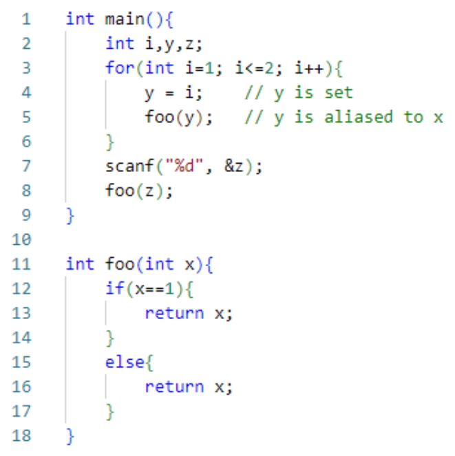 運行main函數,由于循環通過參數y調用foo可以讓foo中的每條語句都被執行,此外還有每個分支/決策。然而使用參數z調用foo單個用例無法達到語句與分支/決策的全覆蓋,因此需要多個測試用例來保證在z的值改變的情況下,foo函數的語句會被全部覆蓋。根據上述的分析,主函數main與函數foo含有數據耦合,它們通過調用參數y與z,形參x而產生了耦合。