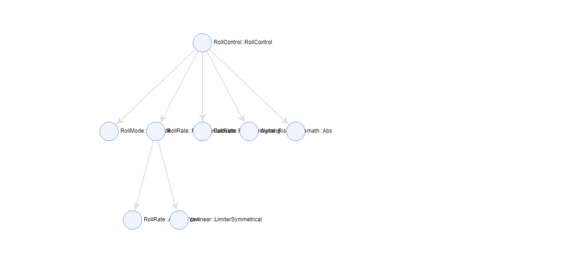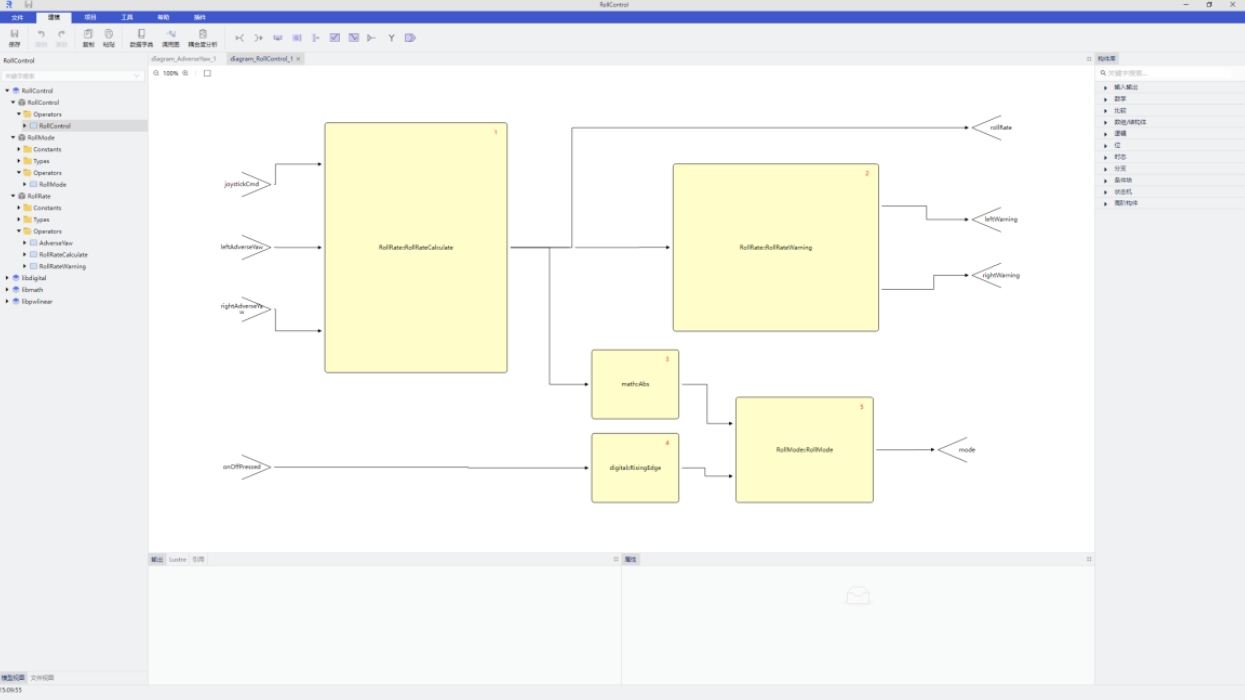 工程師根據上層需求,通過可視化建模方法得到其設計模型,其設計模型能夠通過圖形化或者代碼字符串的方式進行展示,如下圖所示為示例項目Roll Control的圖形化界面。
