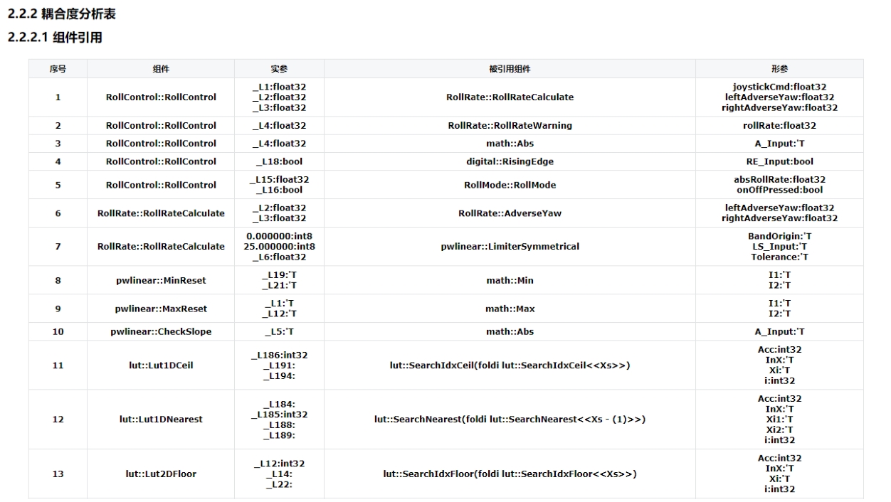 圖12中的信息將函數調用關系以表格的形式進行了展示,該表中另外對實際調用過程中傳遞的參數進行映射,該表不僅展示了調用關系(控制耦合),更進一步包含了調用的參數及其類型(數據耦合),便于用戶根據表格和需求進行比對。