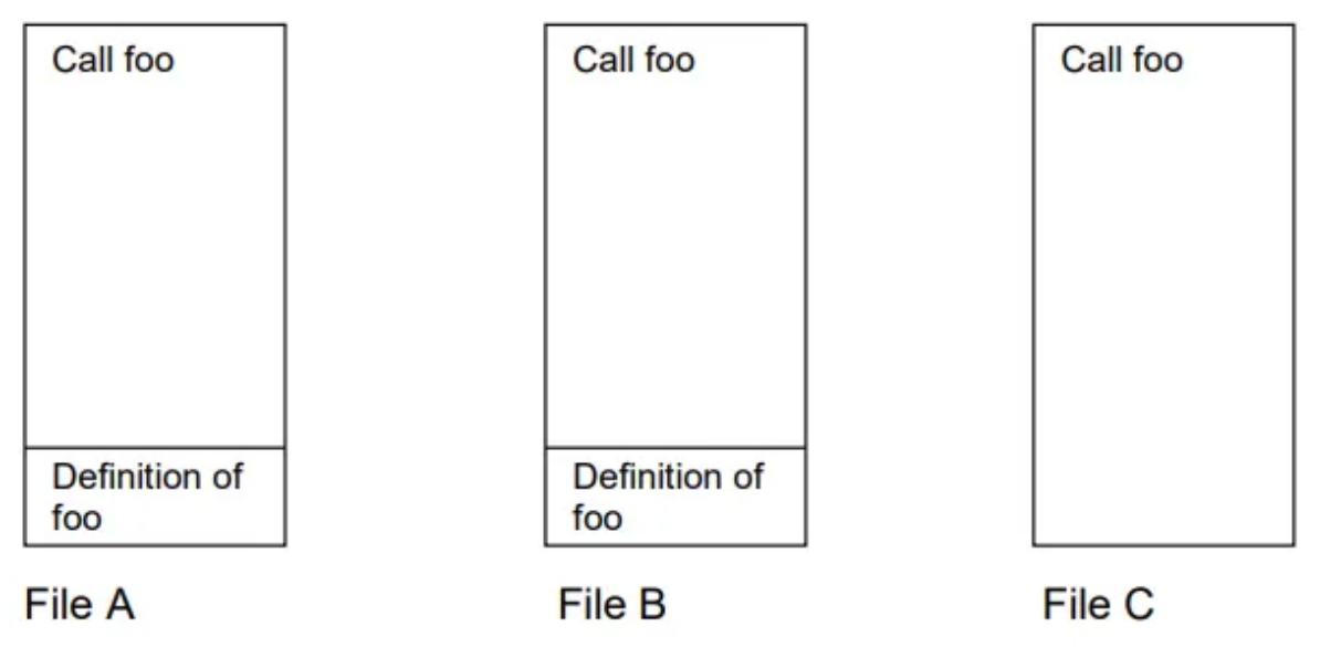 以下具有三個文件的模型,每個文件中至少有一個對函數foo的調用。然而,其中兩個文件包含函數foo的定義。這兩個定義可以相同或可能相似(相同的接口)。