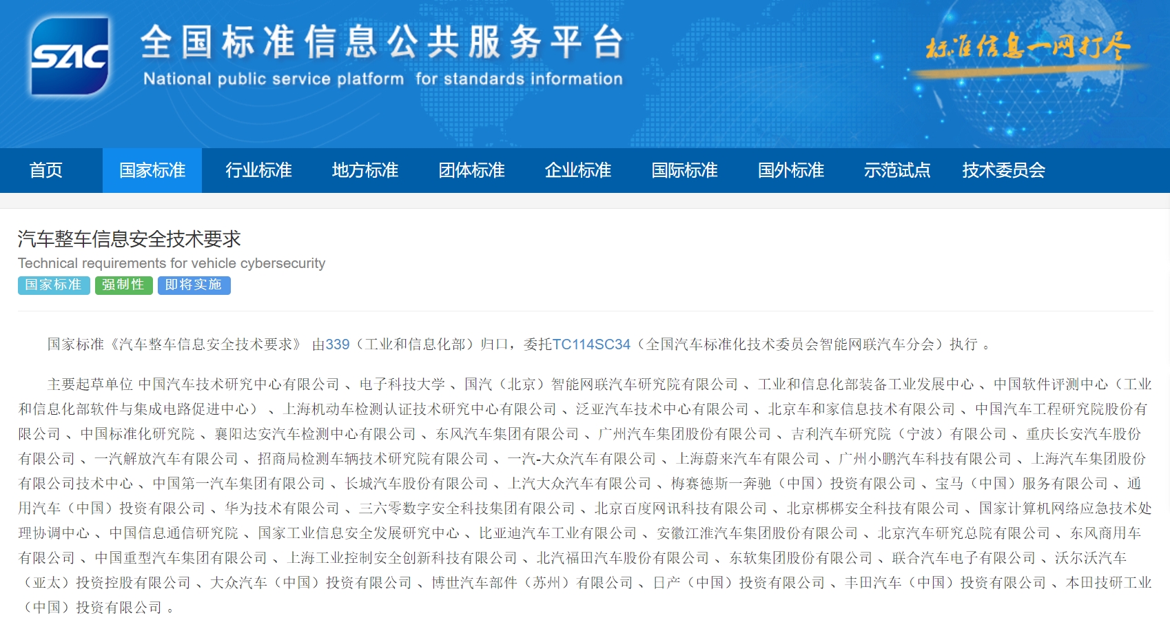 01 引 言 隨著智能網聯汽車技術的飛速發展,車輛的信息系統正在逐步走向高度集成與高度互聯,傳統的車輛控制系統逐漸被復雜的車載操作系統和車聯網應用所取代。與此同時,汽車成為網絡攻擊目標的風險也日益增加,信息安全問題成為智能汽車發展的關鍵挑戰。為規范行業技術要求、提升整車信息安全保障能力,我國于2024年8月23日正式發布國家強制性標準 GB 44495-2024《汽車整車信息安全技術要求》,并將于2026年1月1日正式實施。該標準為整車廠及其供應鏈提供了全面的信息安全技術基線,成為汽車產業信息安全合規建設的重要里程碑。 02 標準背景與核心內容 GB 44495-2024《汽車整車信息安全技術要求》參考吸收了ISO/SAE 21434、UNECE WP.29 R155等國際主流標準和法規內容,結合我國智能網聯汽車發展現狀和實際應用場景,制定了一套覆蓋廣泛、要求明確的信息安全技術框架(如圖1所示)。該標準由工業和信息化部歸口,委托全國汽車標準化技術委員會智能網聯汽車分會執行。上海控安在內的汽車科技領域企業、主機廠、Tier1、高校院所、機構中心等單位聯合參與編制(如圖2所示)。 圖1 標準框架 圖2 標準參編單位 1.1 適用范圍和實施日期 該標準適用于M類、N類及至少裝有1個電子控制單元的O類車輛。 圖3 標準適用范圍 實施日期如下圖所示: 圖4 標準實施日期 1.2 汽車信息安全管理體系要求 整車企業應建立覆蓋產品全生命周期的信息安全管理體系,包括制定內部安全管理流程、識別與處置安全風險、建立測試機制、監測與響應網絡攻擊,以及管控與供應商、服務商之間的信息安全依賴關系,構建系統化的管理體系。 1.3 信息安全基本要求 信息安全基本要求涵蓋風險管理、專用環境保護、安全測試與監測取證、密碼模塊應用、默認安全設置和數據保護等方面。標準要求企業識別關鍵風險,實施有效管控措施,確保系統具備抗攻擊能力和取證能力;同時,使用符合標準的密碼算法與模塊,采用默認安全設置,保障數據處理過程中的個人隱私和用戶知情同意權,全面滿足信息安全防護的基礎要求。 1.4 信息安全技術要求 標準將信息安全技術要求劃分為以下四大核心領域: 1) 外部連接安全:要求對外部通信接口(如USB、藍牙、WIFI、蜂窩網絡等)進行訪問控制、身份認證和數據保護。 2) 通信安全:規定整車內部和外部通信在數據傳輸過程中必須具備加密、防篡改、防重放等能力,確保數據完整性與保密性。 3) 軟件升級安全:包括升級包完整性驗證、簽名認證、版本控制、回滾防護等機制,保障遠程升級的安全可控。 4) 數據安全:涉及用戶隱私數據保護、車輛運行數據加密存儲、本地訪問控制等內容,強化車輛對關鍵數據的生命周期管理能力。 1.5 檢查與試驗方法 該章節主要包括汽車信息安全管理體系檢查、基本要求檢查和技術要求測試。前兩部分主要是針對信息安全相關的文檔進行檢查,確認車輛制造商和測試車輛分別滿足標準第5、6章的要求。技術要求測試主要針對上述的四大核心領域進行安全測試,具體的測試項目和內容如下: 1) 外部連接安全測試 圖5 外部連接安全測試 2) 通信安全測試 圖6 通信安全測試 3)軟件升級安全測試 圖7 軟件升級安全測試 4) 數據安全測試 圖8 數據安全測試 1.6 同一型式判定 標準中的“同一型式判定”旨在明確信息安全測試的一致性范圍。若車輛在信息安全管理體系、電子電氣架構、關鍵控制器及通信協議等方面保持一致,且核心軟硬件版本無影響信息安全的差異,即可視為同一型式。若僅部分參數變更且滿足相應條件,經審批許可后可獲得擴展。同時,數據處理功能中的匿名化算法、控制器和采集設備一致,也可視為同一型式。 03 汽車信息安全測試方案 為滿足GB 44495-2024《汽車整車信息安全技術要求》等安全標準的要求,上海控安基于汽車行業信息安全相關法規和標準提供安全測試方案,標準覆蓋范圍如下圖: 圖9 標準和法規覆蓋范圍 主要圍繞六個方面進行測試能力覆蓋。如圖,以測試能力為核心,從“硬件、車外通信、車載網絡、軟件、數據、升級”六大維度系統化布局,全面支撐智能網聯汽車信息安全能力的合規建設和驗證,符合法規落地與產業實際需求。 圖10 汽車信息安全測試覆蓋面 主要的測試工具包括SmartRocket TestSec自動化智能模糊滲透測試系統,可針對車載總線及車聯網協議的自動化智能黑盒模糊滲透測試工具,主要負責汽車通信層面的安全測試,提供各種通信協議的模糊和滲透測試功能,通過自動化、系統化、智能化的模糊滲透測試方法,能夠有效發現并修復智能網聯汽車通信系統中潛在的安全缺陷,提高智能網聯汽車安全性。 SmartRocket PeneX汽車網絡安全測試系統,支持對整車及車輛零部件及子系統實施網絡安全測試,包含硬件安全、軟件安全、數據安全和軟件升級四大安全測試系統;支持合規性測試,包含國內外的法規及標準;提供實驗室機柜部署方案及便攜式工具箱方案,可按需靈活選擇。 圖11 汽車信息安全測試工具 04 總 結 GB 44495-2024《汽車整車信息安全技術要求》的發布,標志著我國汽車信息安全法規體系邁入全面落地階段。該標準不僅強調組織級的信息安全體系構建與基本安全能力建設,還在技術層面明確了外部連接、通信、升級、數據等防護能力和測試要求。面對日益復雜的汽車信息安全威脅,行業各