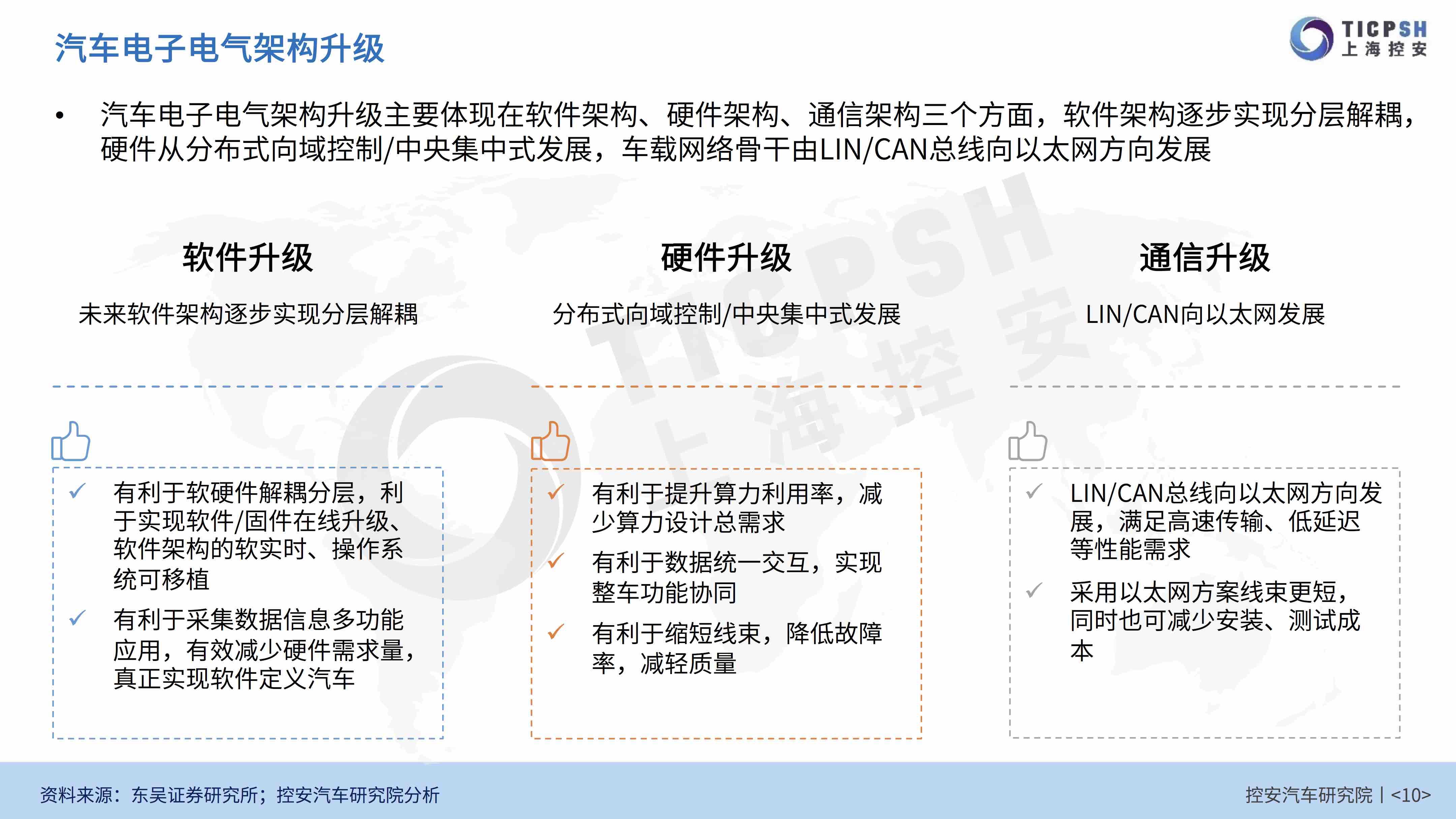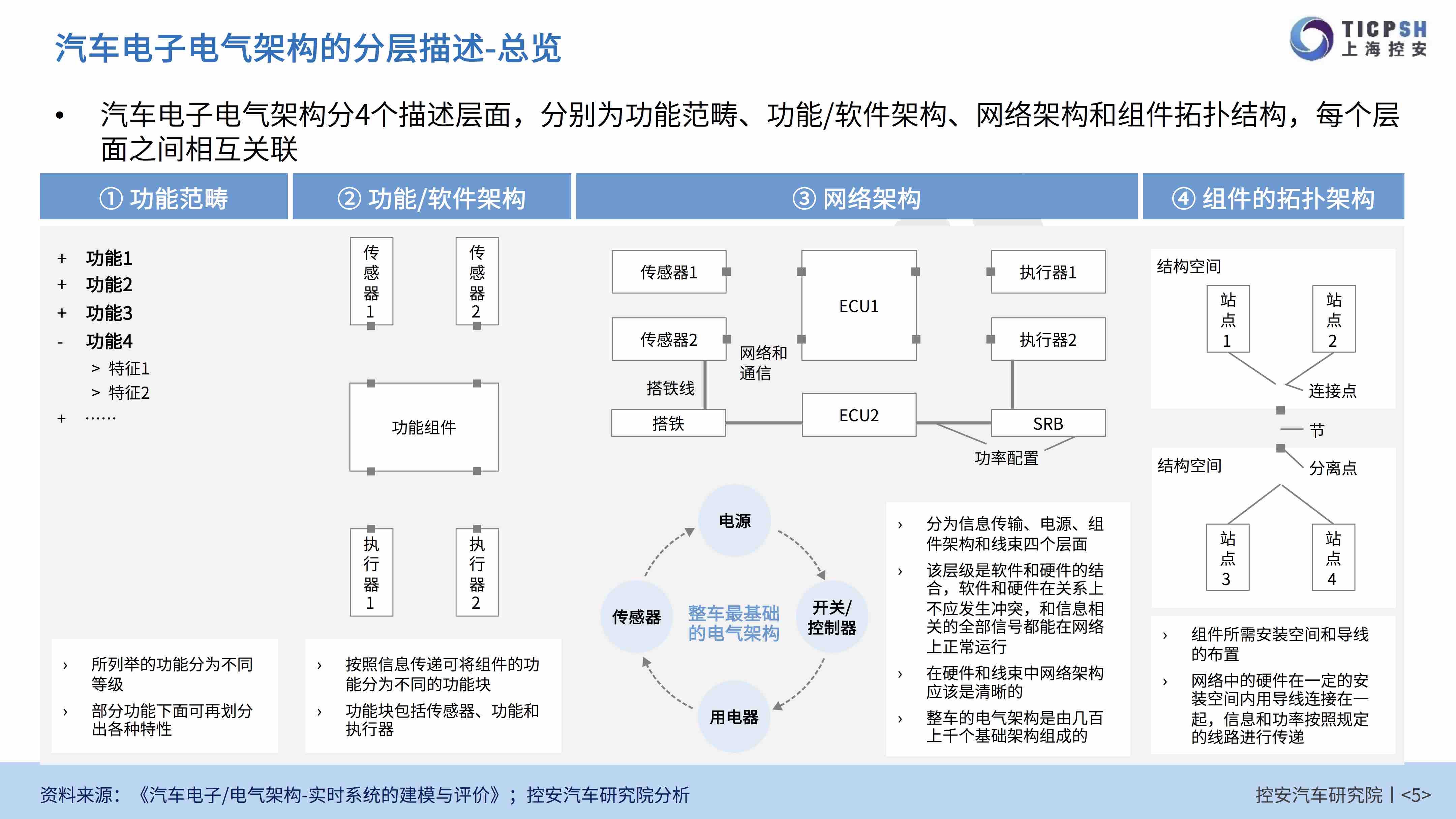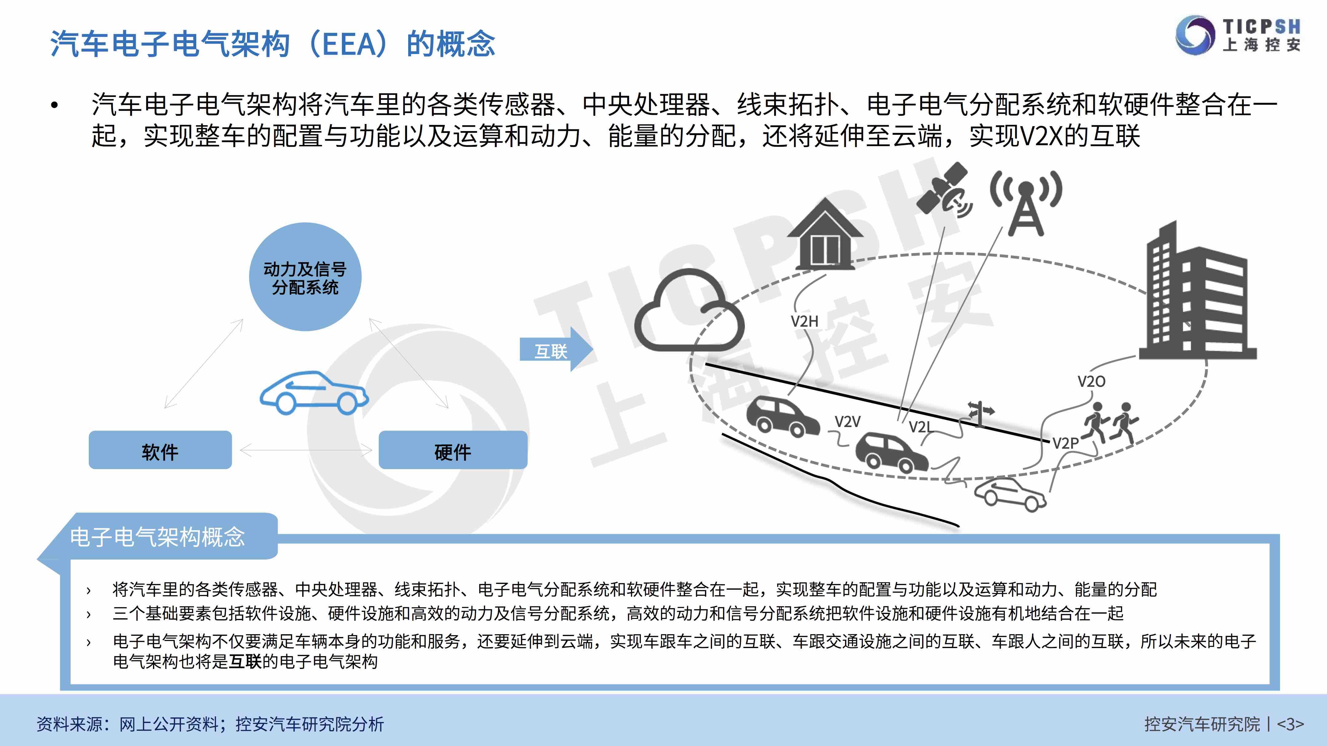 汽車電子電氣架構將汽車里的各類傳感器、中央處理器、線束拓撲、電子電氣分配系統和軟硬件整合在一起,實現整車的配置與功能以及運算和動力、能量的分配,不僅要滿足車輛本身的功能和服務,還要延伸到云端,實現車跟車之間的互聯、車跟交通設施之間的互聯、車跟人之間的互聯,所以未來的電子電氣架構也將是互聯的電子電氣架構。
