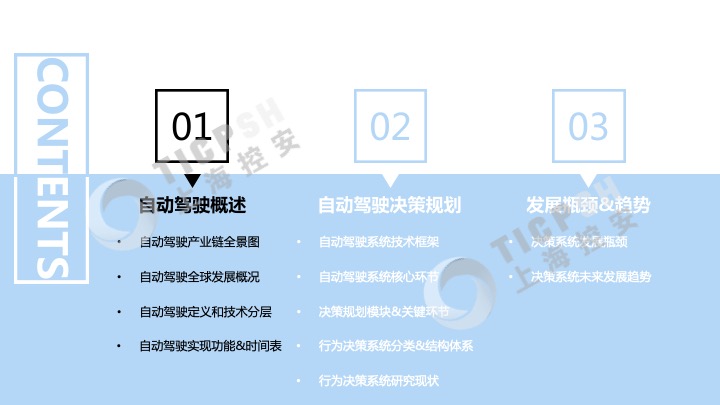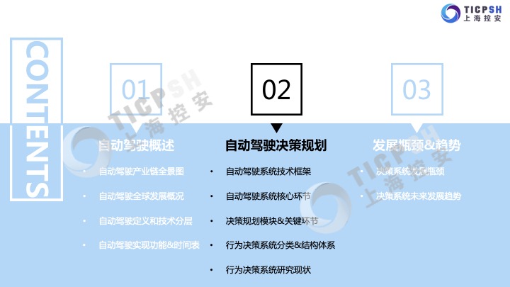 控安汽車研究院發布《自動駕駛決策與規劃研究報告》(2020版)。報告介紹了自動駕駛發展概況、自動駕駛產業鏈全景圖、自動駕駛實現功能及時間表、自動駕駛決策規劃關鍵環節以及決策系統的研究現狀等,分析研究了決策系統結構體系、優缺點對比、發展瓶頸以及未來發展趨勢等。