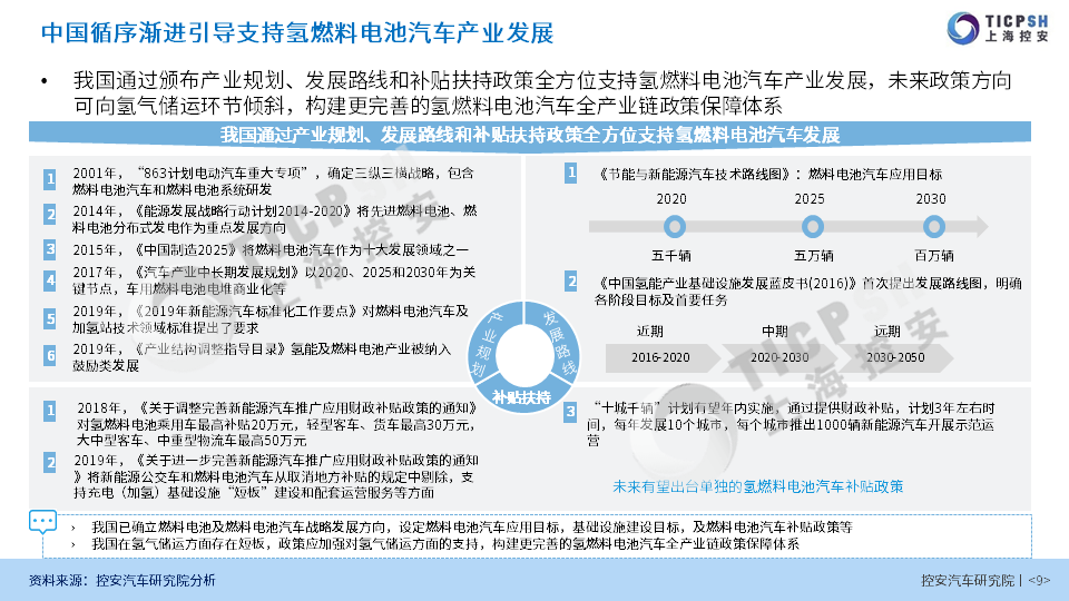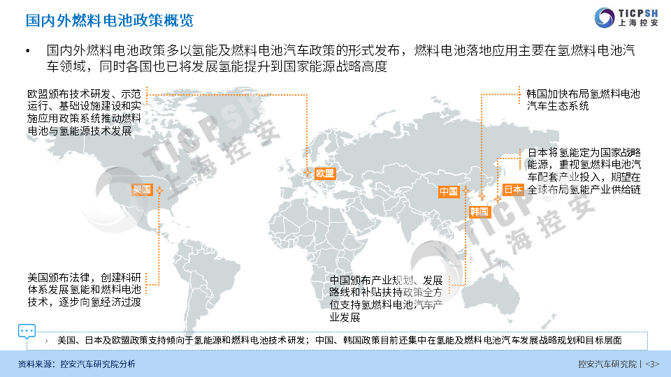 隨著燃料電池產業發展逐漸成熟,中國在燃料電池領域的政策支持力度逐漸加大,政策從產業規劃、發展路線和補貼扶持等方面全方位支持燃料電池產業發展,且獨立于新能源汽車補貼政策之外的燃料電池汽車補貼政策即將出臺。目前國內外政策多以氫能及燃料電池汽車政策的形式發布,美國、日本及歐盟燃料電池政策側重于氫能源和燃料電池技術研發。