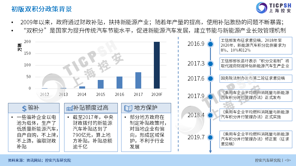 2009年以來,我國出臺新能源汽車產業國家政策共60余項,逐步形成了較為完善的政策體系,如新能源汽車補貼政策、雙積分政策、股比開放政策等,從宏觀統籌、推廣應用、行業管理、財稅優惠、技術創新、基礎設施等方面全面推動了我國節能與新能源汽車產業快速發展。