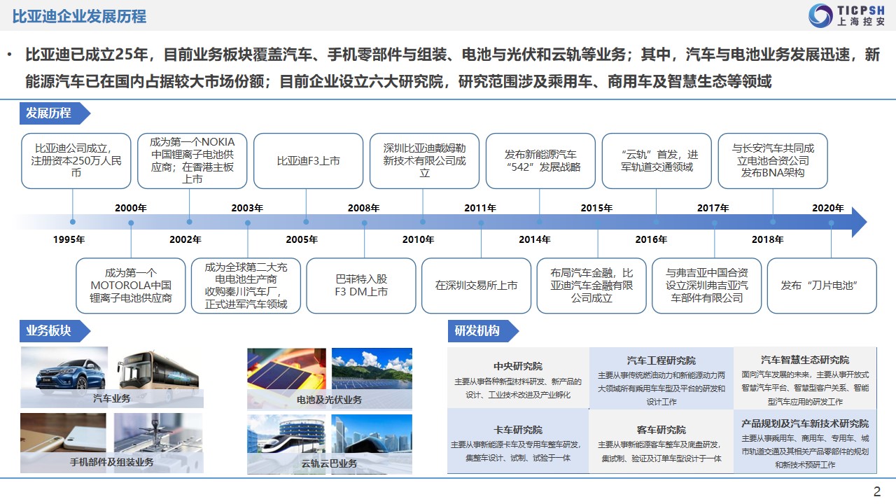 控安汽車研究院發布《比亞迪企業研究報告》。報告介紹并分析了比亞迪業務板塊、組織架構,品牌及產品布局,整車及零部件平臺化,數字化與移動出行服務和電子電氣架構等內容。