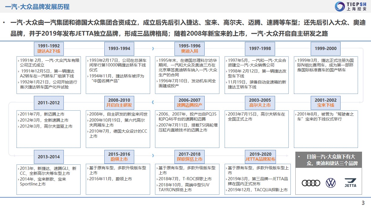 大眾集團在國內目前共有三家整車合資公司,分別為一汽大眾、上汽大眾和江淮大眾。三家企業的戰略規劃、市場定位、產品布局等均存在一定差異。