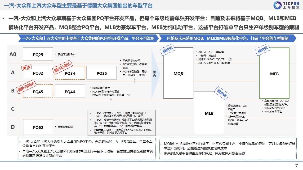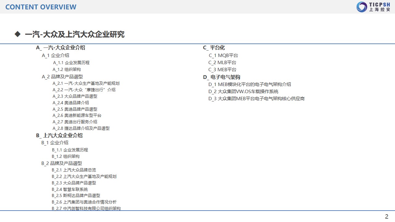控安汽車研究院發布《一汽大眾&上汽大眾企業研究報告》。報告介紹并分析了一汽大眾和上汽大眾的組織架構,品牌及產品布局,整車及零部件平臺化,數字化與移動出行服務和電子電氣架構等內容。