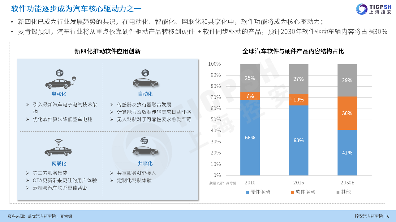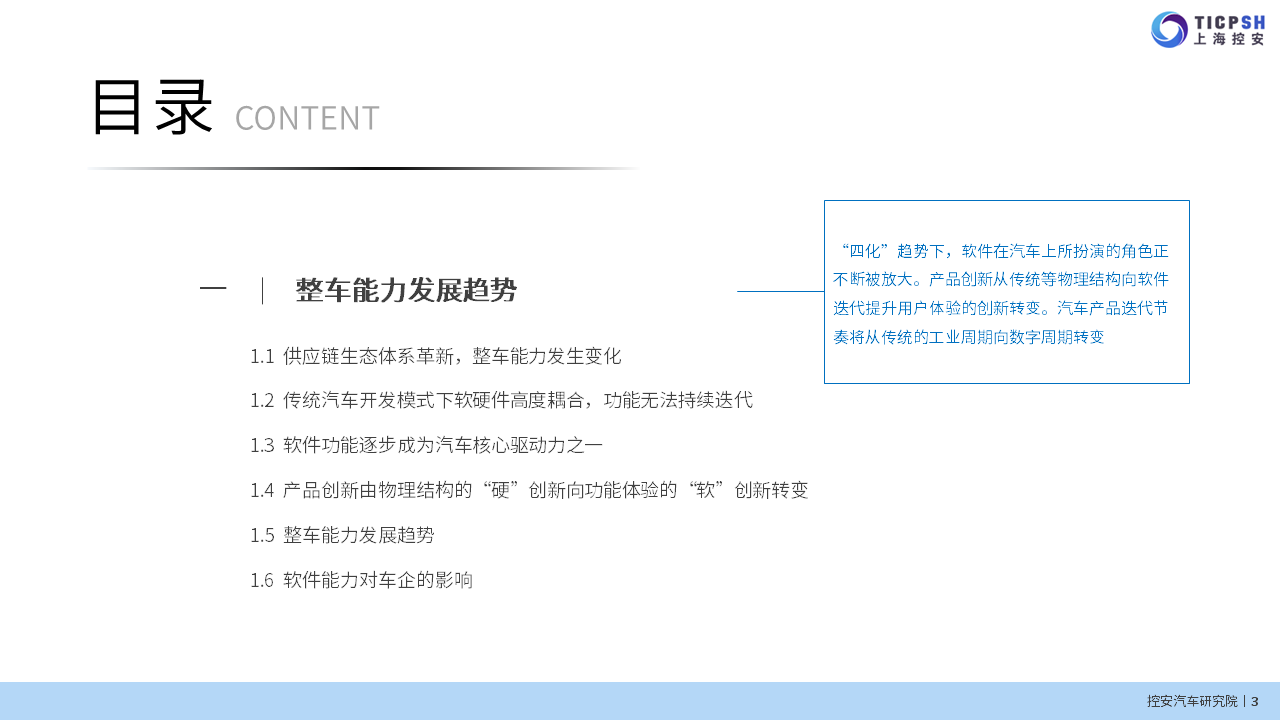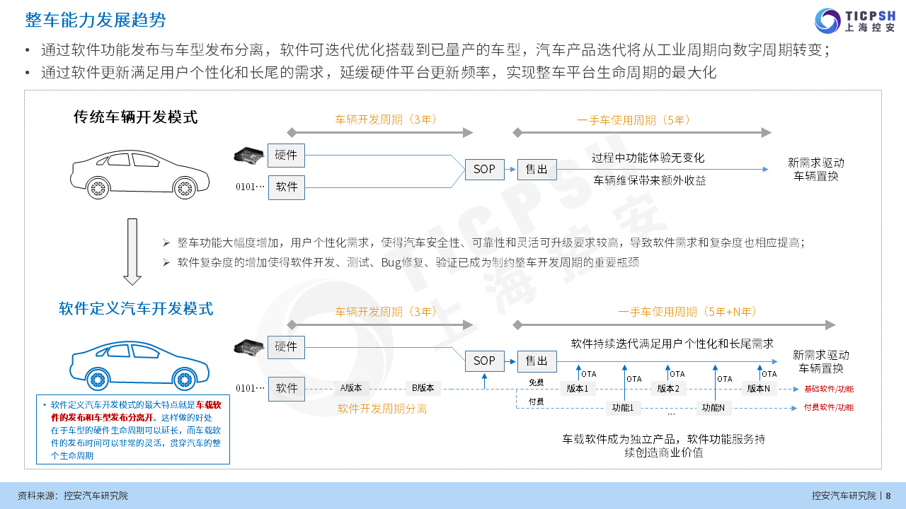 控安汽車研究院近期發布《軟件定義汽車趨勢下企業能力規劃研究》(2021版)。報告首先介紹了在大環境下汽車行業整車能力發展趨勢;其次圍繞SDV趨勢下企業轉型模式及代表性實施方案進行展開;最后,根據當前行業發展現狀給出相應的能力建設策略及實施路徑。