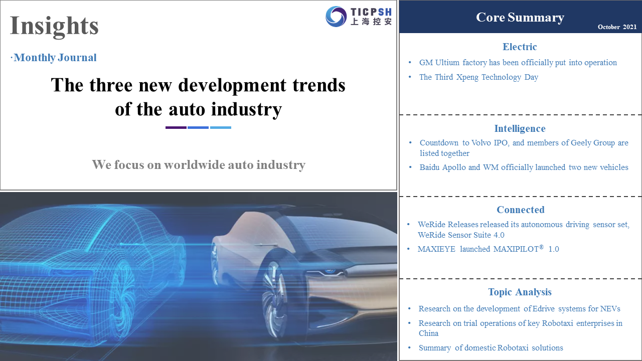 控安汽車研究院將定期發布《洞察:汽車產業新三化》月刊報告,緊扣汽車“新三化”,針對當月發生的重要行業新聞進行深度分析解讀,并設有市場板塊,主要分析月度車市銷量、新能源汽車新車型上市匯總、重點上市新車智能網聯技術搭載等情況,為汽車行業提供專業的資訊解讀和咨詢服務。