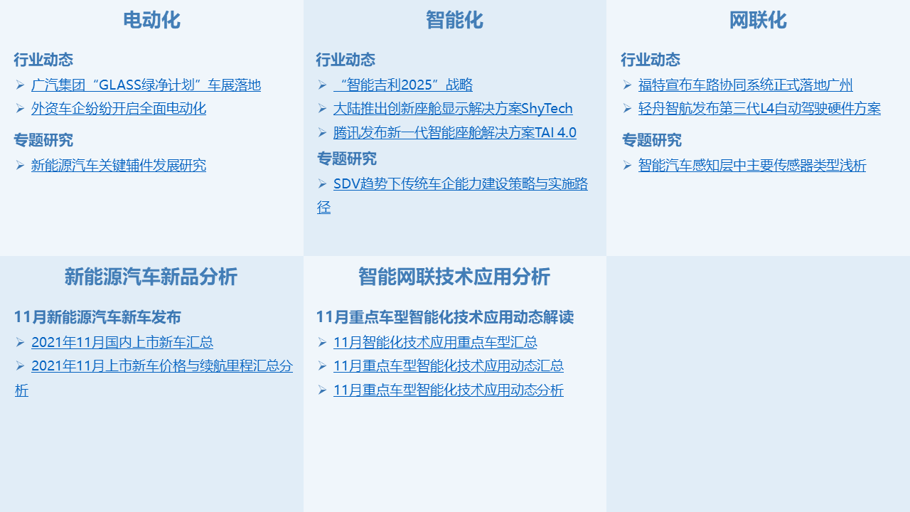 控安汽車研究院將定期發(fā)布《洞察:汽車產(chǎn)業(yè)新三化》月刊報(bào)告,緊扣汽車“新三化”,針對(duì)當(dāng)月發(fā)生的重要行業(yè)新聞進(jìn)行深度分析解讀,并設(shè)有市場板塊,主要分析月度車市銷量、新能源汽車新車型上市匯總、重點(diǎn)上市新車智能網(wǎng)聯(lián)技術(shù)搭載等情況,為汽車行業(yè)提供專業(yè)的資訊解讀和咨詢服務(wù)。