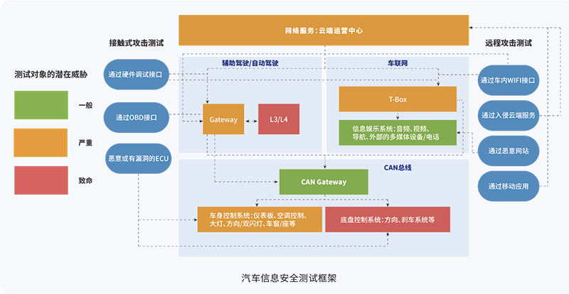 測試方案覆蓋車機(jī)軟件、車載通信、車內(nèi)智能終端設(shè)備、車內(nèi)總線等檢測環(huán)境